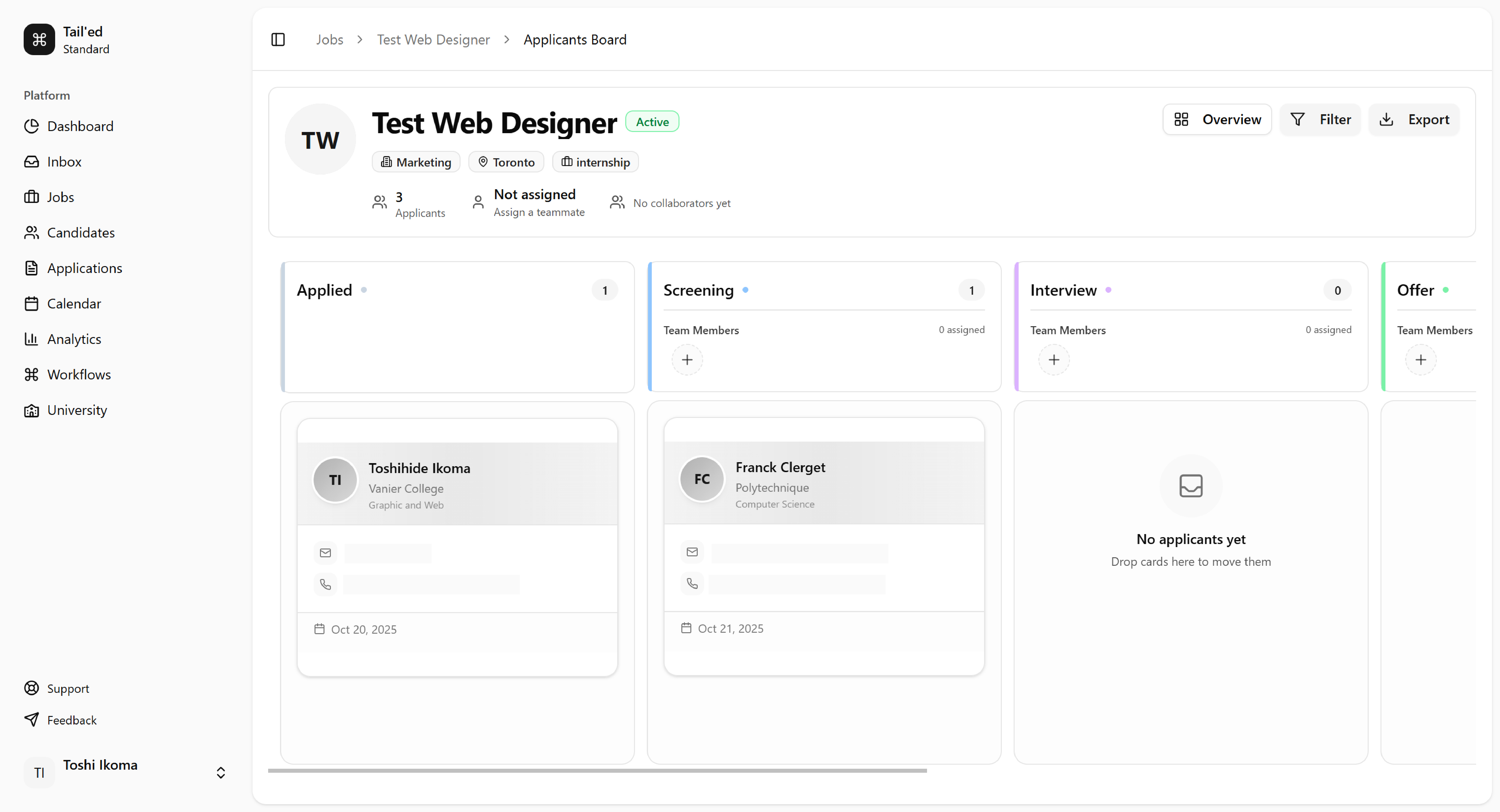 L’interface est pensée pour être intuitive. Grâce à une vue de type Kanban, les équipes peuvent suivre chaque étape du processus de sélection en un coup d’œil : du premier contact jusqu’à l’embauche. Tout se fait par de simples glisser-déposer, ce qui rend la gestion fluide et collaborative.