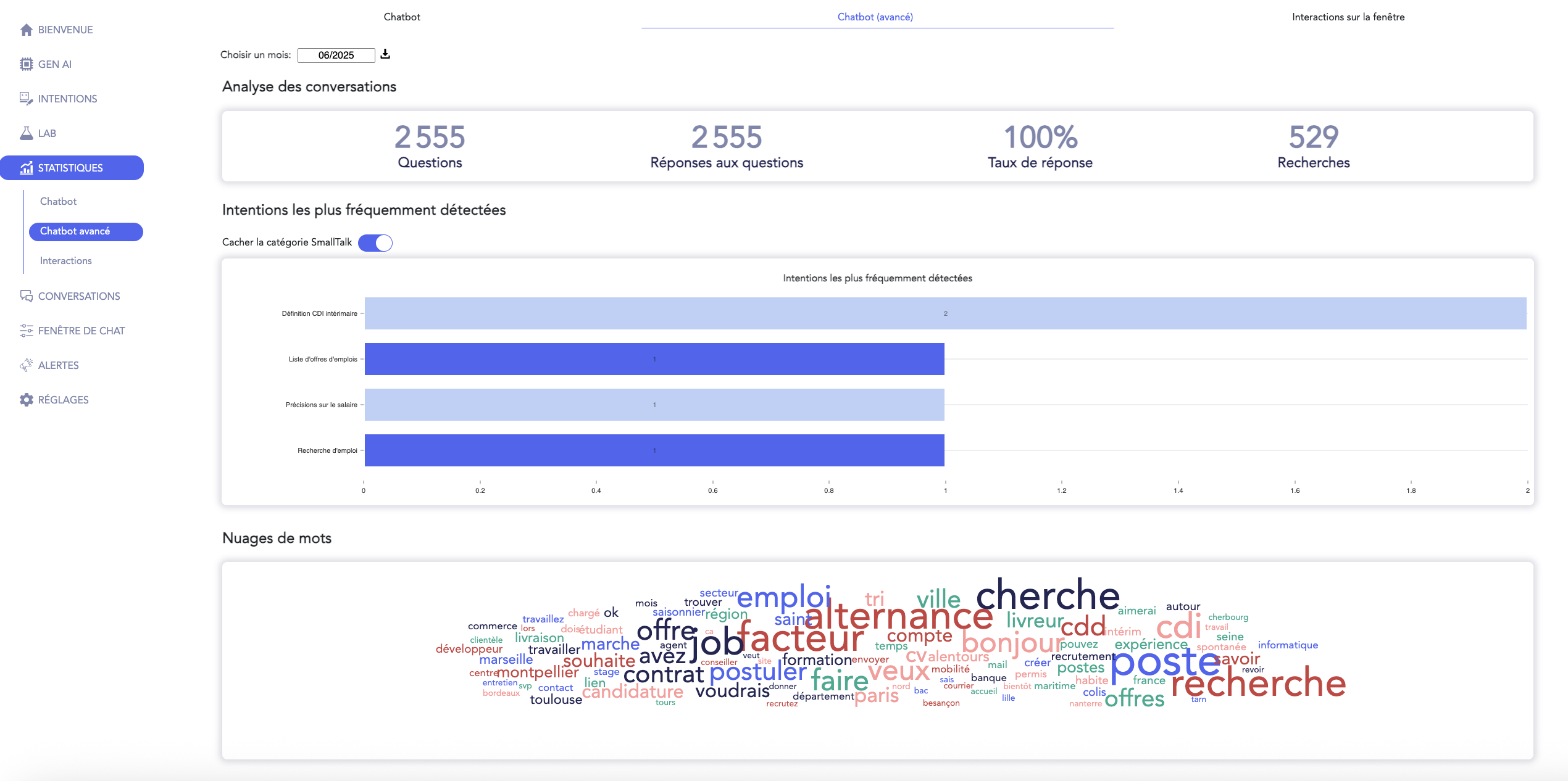 Concrètement, au-delà des données classiques — trafic, taux de clic, taux de conversion, provenance des candidatures — nous capturons et analysons toutes les interactions entre les candidats et notre agent conversationnel.
